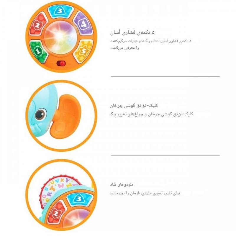 دارای 5 کلید که با فشردن دکمه ها کودک  میتواند اسامی اعداد موزیک  و حروف انگلیسی را بشنود